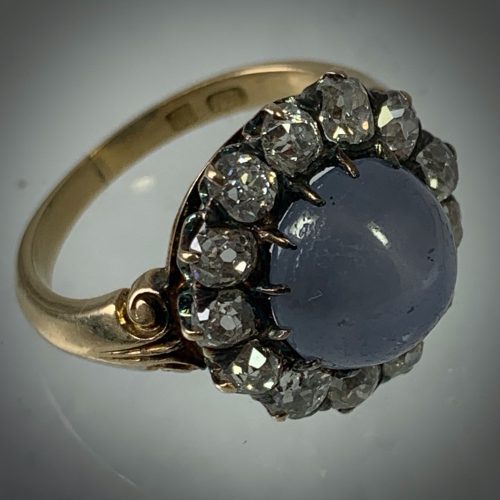 Ca 1880 , French gold cluster ring with cabochon star sapphire and old full cut diamond surround.