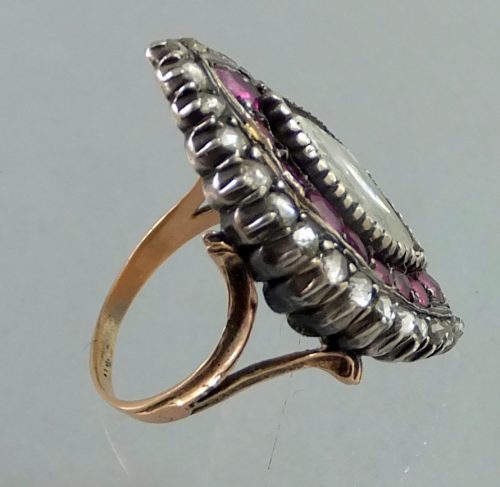 English ca 1770 gold and silver ring set in the middle with a single diamond / weighing over one carat / , surrounded by one row of diamonds and one row of burma rubys.A are foiled from underneath.