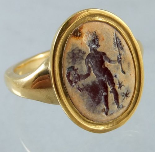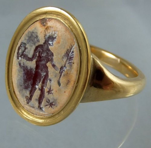 Ancient intaglio of an athlete showing the attributes of victory in each hand, the laurel wreath and palm branch. Either a gladiator or athlete.