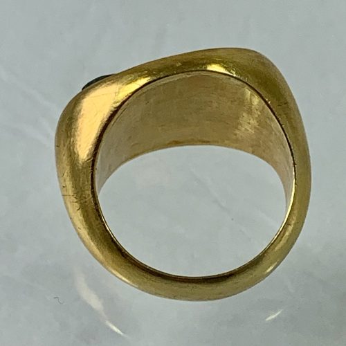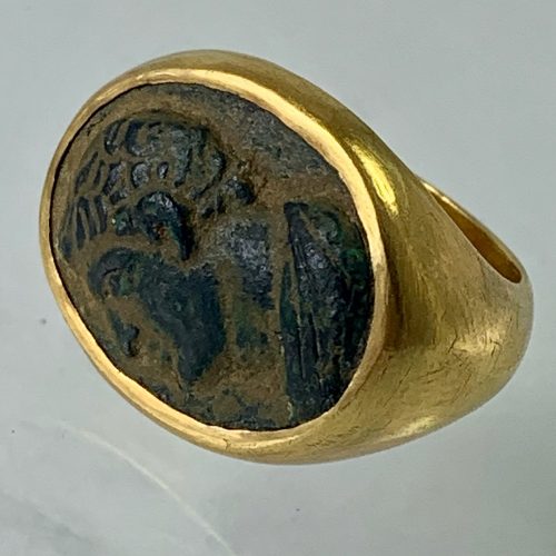 Ancient Greek bronze ring ca 400 B.C. of a young male athlete in a later high carat mount