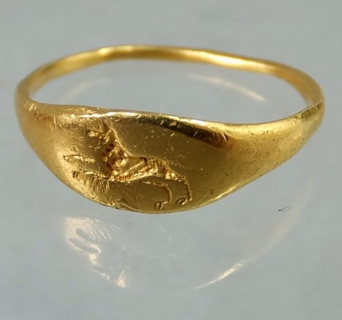 Ca 200 A.D. ancient Roman gold ring with an engraved wolf.