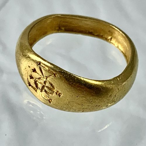 Sixth century Byzantine gold ring with engraved bezel. The engraving is a cipher .