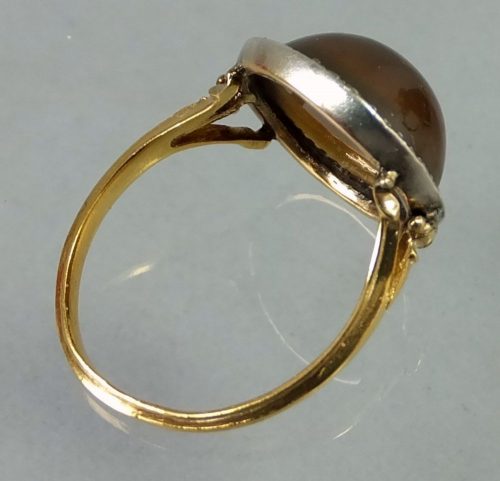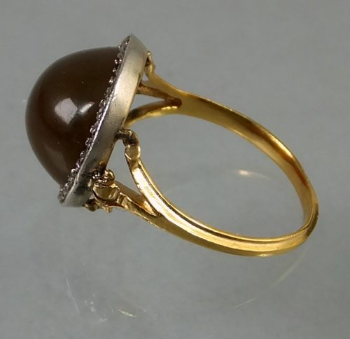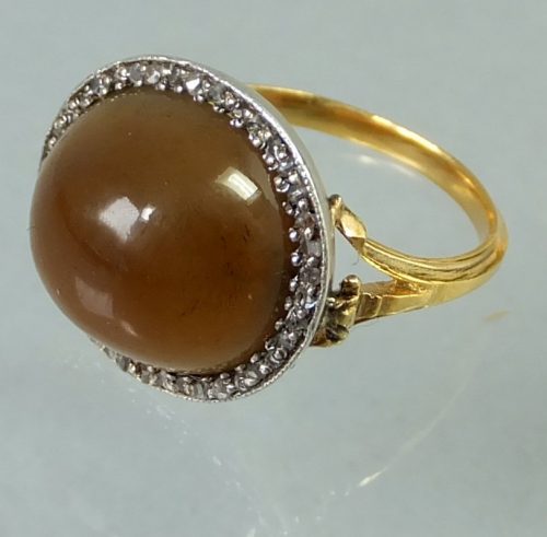 Silver and gold ring set with a high cabochon agate with diamonds set surround.