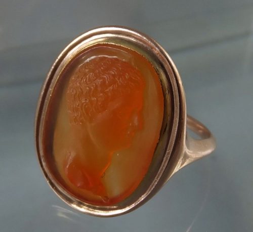 Eighteenth century carnelian cameo ring.The cameo is of the young Antonius. The pink gold setting and cameo are ca 1770 , Grand Tour .