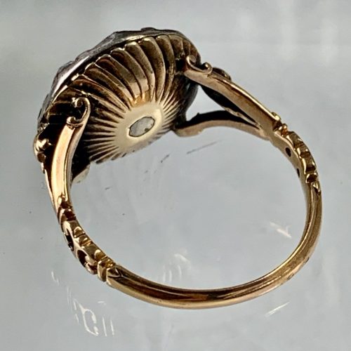 England ca 1740 silver and gold diamond ring set with rose cut diamonds. The diamonds are in a closed back setting and are foiled.