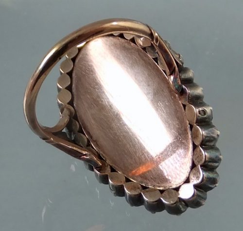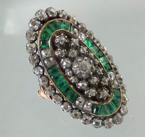 English Ca 1770 antique gold and silver ring set with diamonds and emeralds.
