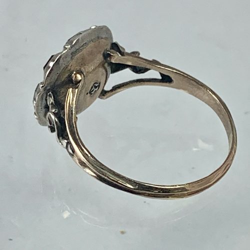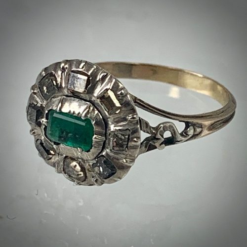 Ca 1740 gold and silver ring. The bezel is set with eight table cut diamonds and the center is set with an emerald.