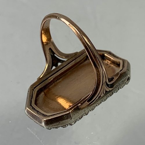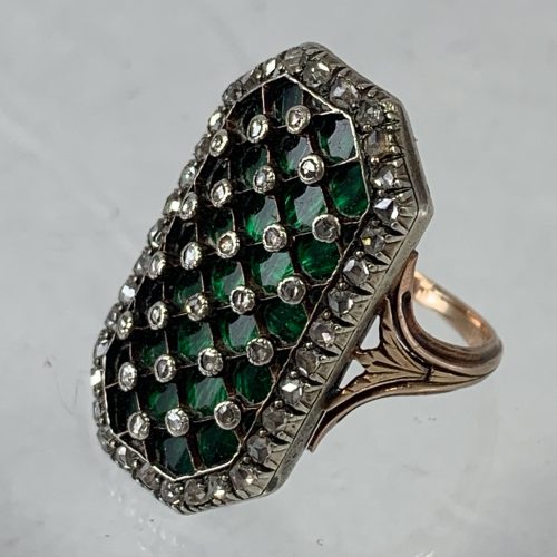 French ca 1780 antique gold ring with diamonds and green enamel.