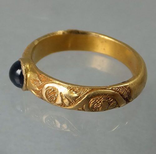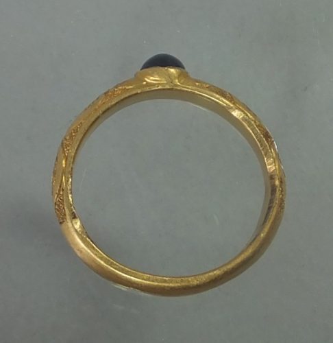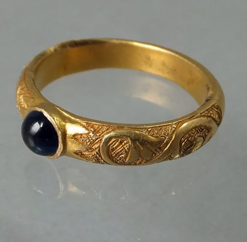 Medieval gold ring, England ca 1350-1400 with engraved shoulders and a cabochon sapphire.