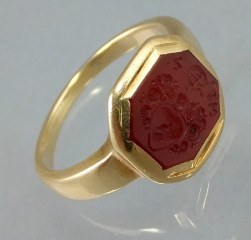 Ca 1680 seal carved armorial carnelian, in contemporary gold setting. England ca 1680.