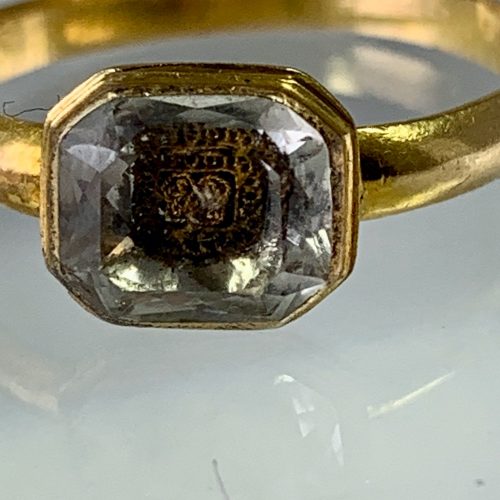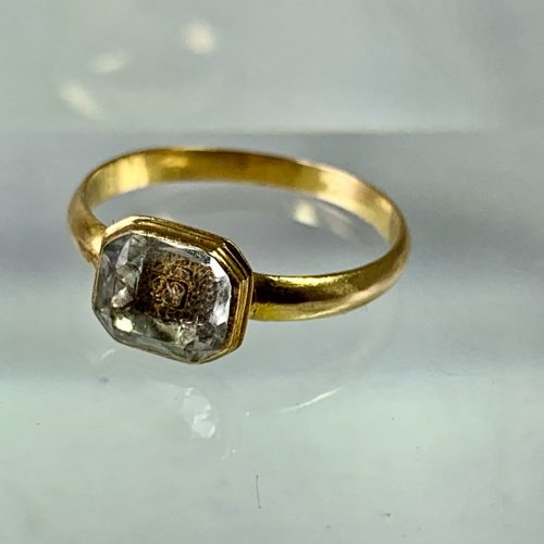 Ca 1680 memorial gold ring with octagonal table cut rock crystal. Behind the rock crystal braid monogram on silk.