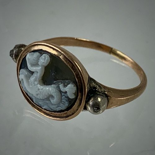 The eighteenth century gold and silver ring is with two small diamonds in silver setting positioned on either side of the cameo.Perhaps the first recorded merman was the early Babylonian sea-god Ea, whose Sumerian Enki, and was known to the Greeks as Oannes. Oannes had a fish head and man’s head beneath, and both a fish tail and man like legs, according to Berossus.[a][1] The fish god Dagon of the Philistines, with a fish-tailed body, may derive its origins from these earlier Mesopotamian gods.[2]